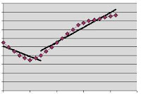 And to show how the discontinuity in the two regression lines does not mean anything for the two populations, here is the underlying data for the two lines above, a continuous curve.